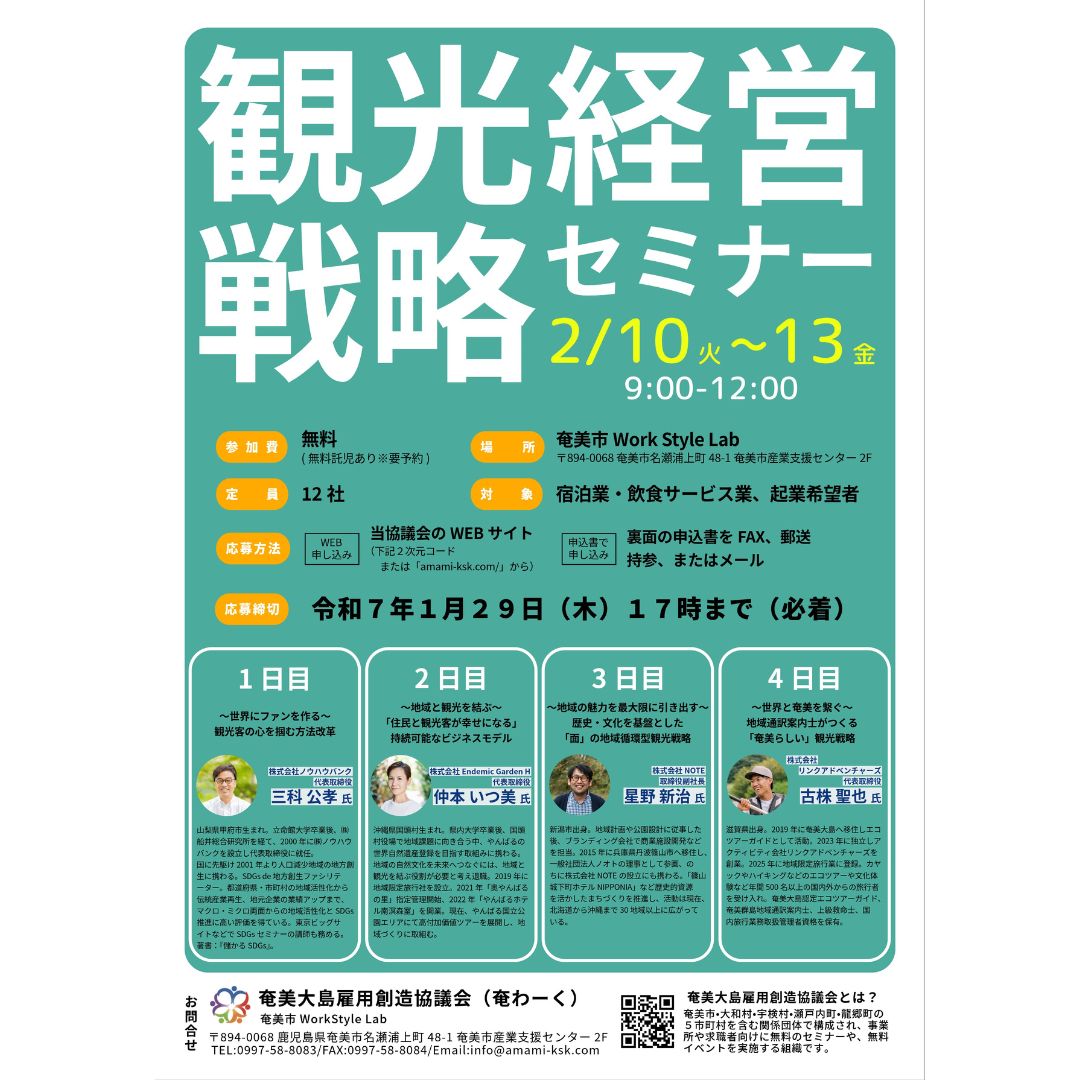 奄美の観光業は今、生き残りをかけて何をやるべきか? 人手不足のなか、観光業における働き方改革とは?生産性や稼働率をあげるためにできることは?また、増える外国人観光客(インバウンド)への対応はどうしたらよいのか?4名の講師から学びます。 📅 日程・カリキュラム 全4日間 💡【1日目】 令和8年2月10日(火) 午前9:00~12:00【2日目】 令和8年2月11日(水) 午前9:00~12:00【3日目】 令和8年2月12日(木) 午前9:00~12:00【4日目】 令和8年2月13日(金) 午前9:00~12:00 👨🏫 講師【1日目】 三科 公孝 氏 (株式会社ノウハウバンク代表取締役)【2日目】 仲本 いつ美 氏 …