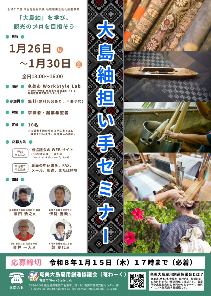大島紬を学び、観光のプロを目指そう! 奄美大島での観光関連事業所へ就職を目指している、もしくは起業を検討している方向けのセミナーです。